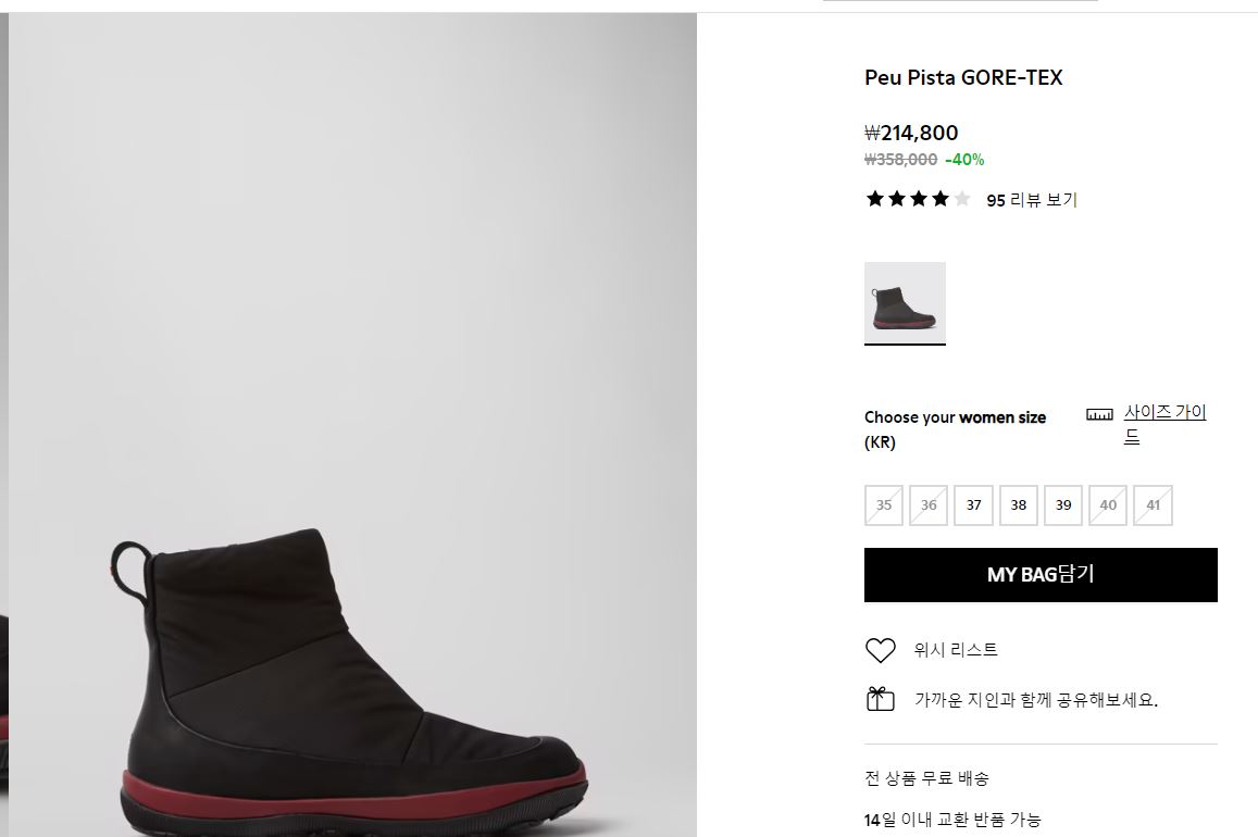 지난 번 K21 Runner 에 이어서 이번에는 Peu Pista Gore-Tex 방한화 리뷰. 캠퍼 라는 브랜드의 서비스속도까지 포함하여 백프로 만족하는 건 아니지만 신발은 디자인과 착화감이 너무 좋아서 또 사게 되었다. 방한 기능까지 있는 신발이다. 한국 사이즈로 운동화는 샌들이든 230이 가장 잘 맞는데, 그래서 사이즈 36. 아주 딱 잘 맞는다. 엄청 낙낙하게 맞을 줄 알았는데 겨울 양말을 신고 딱 잘 맞는 사이즈.